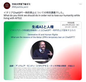 以下は要約です:このプレゼンテーションでは、ChatGPTとデータ保護に関する法的・規制上の課題を説明し、特に2023年のイタリアにおける一時的な禁止措置に焦点を当てています。 Continue reading “中央大学におけるAIと人権に関する講演”